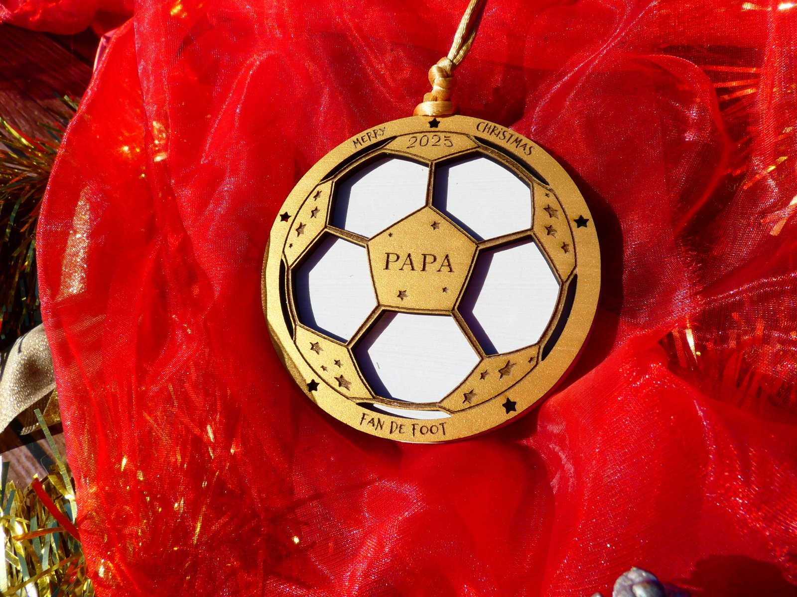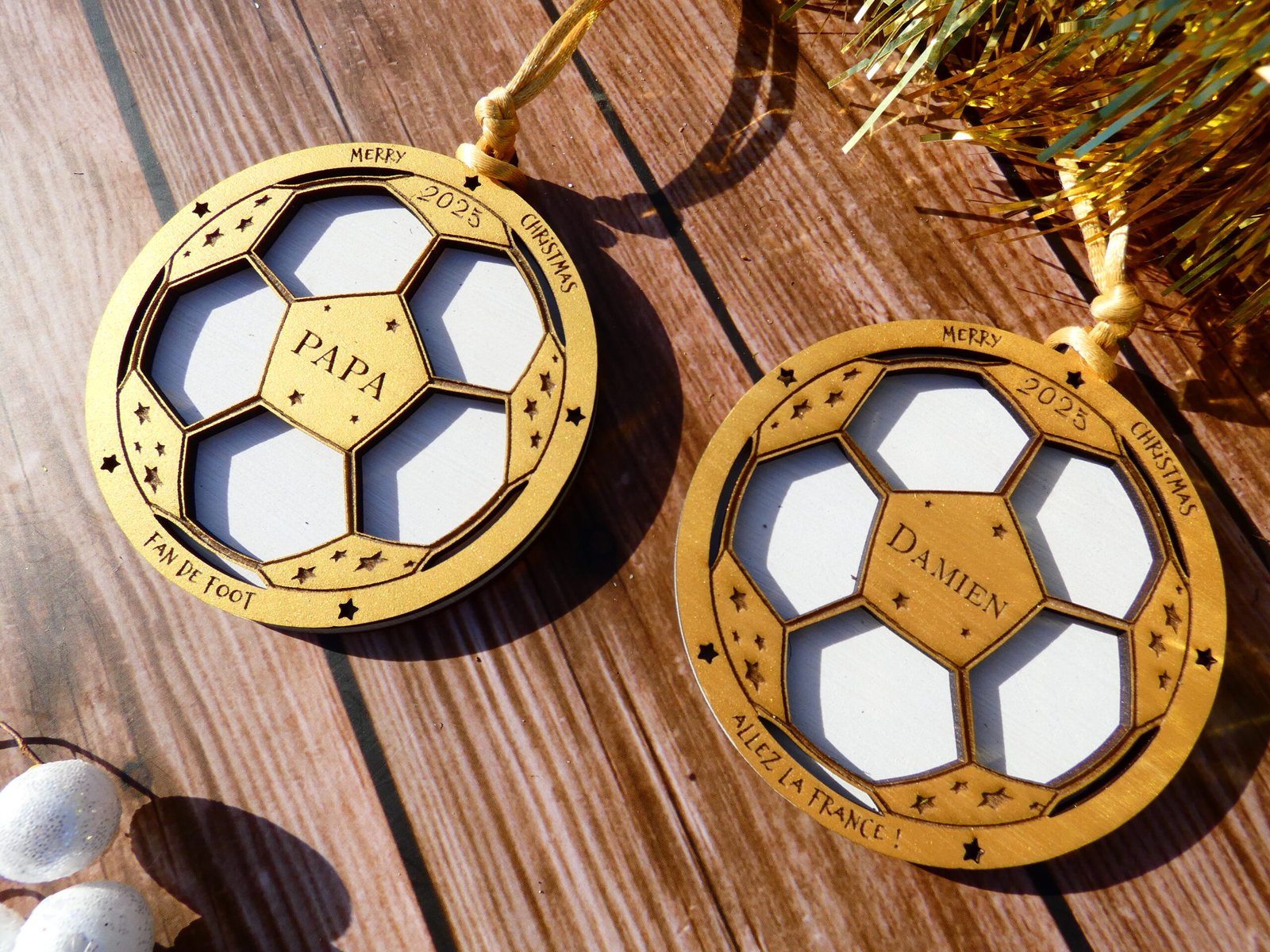 Boule de noël en bois peint pour amoureux de foot et supporter, personnalisée, modèle 2