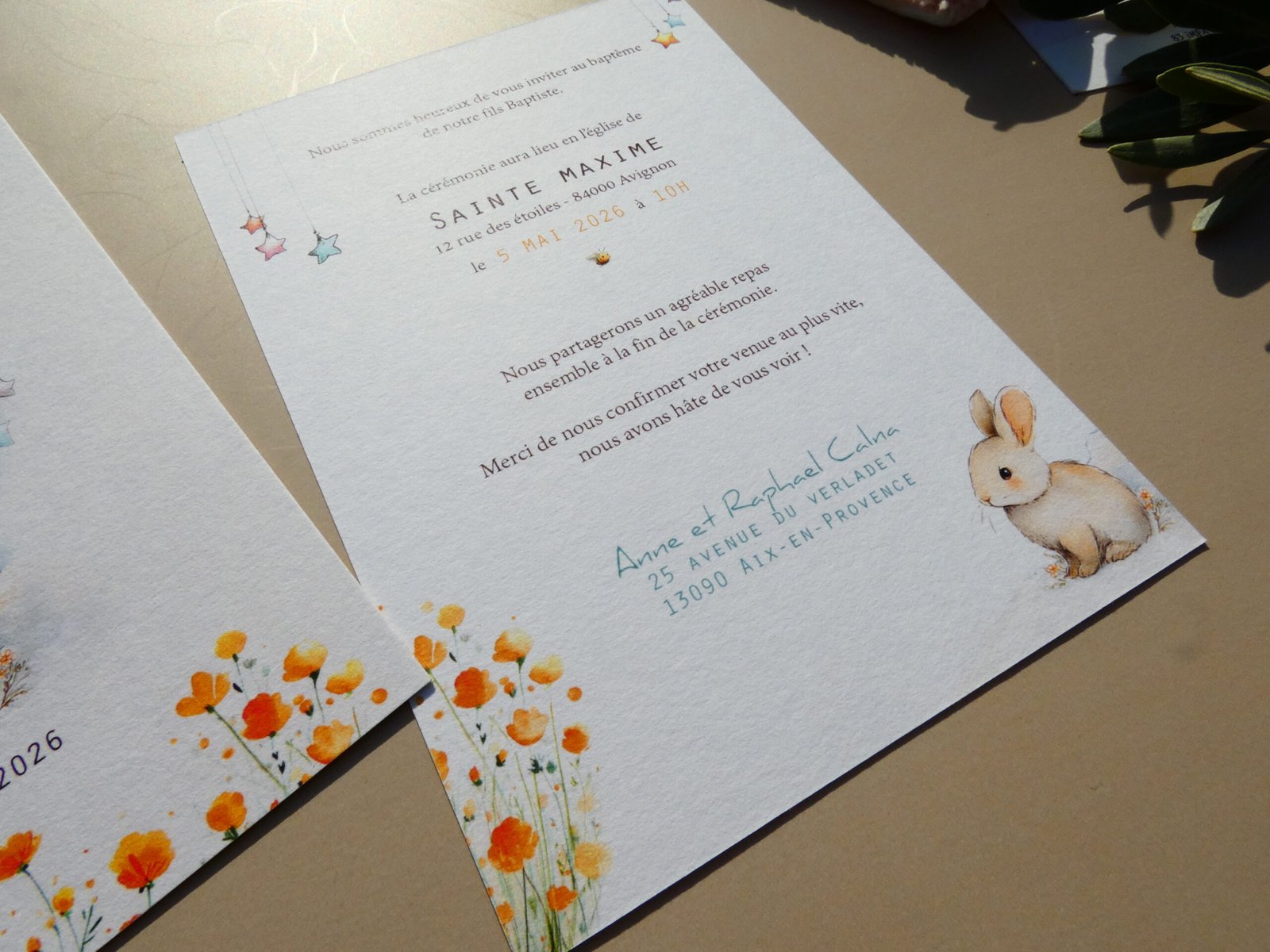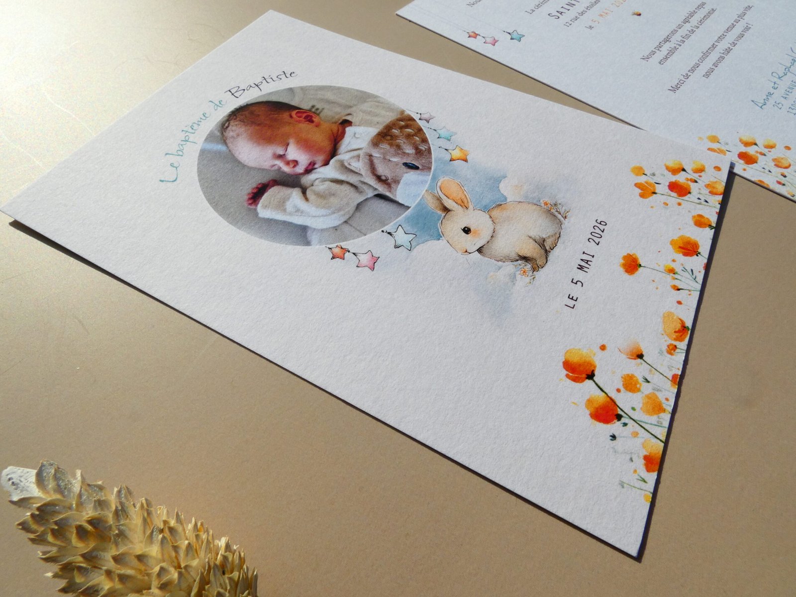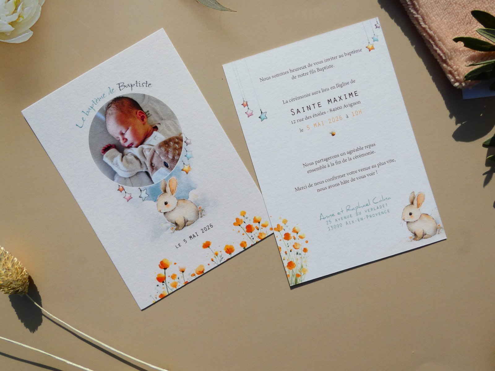 Faire-part de baptême mixte, fille ou garçon, thème petit lapin, poétique et rêveur