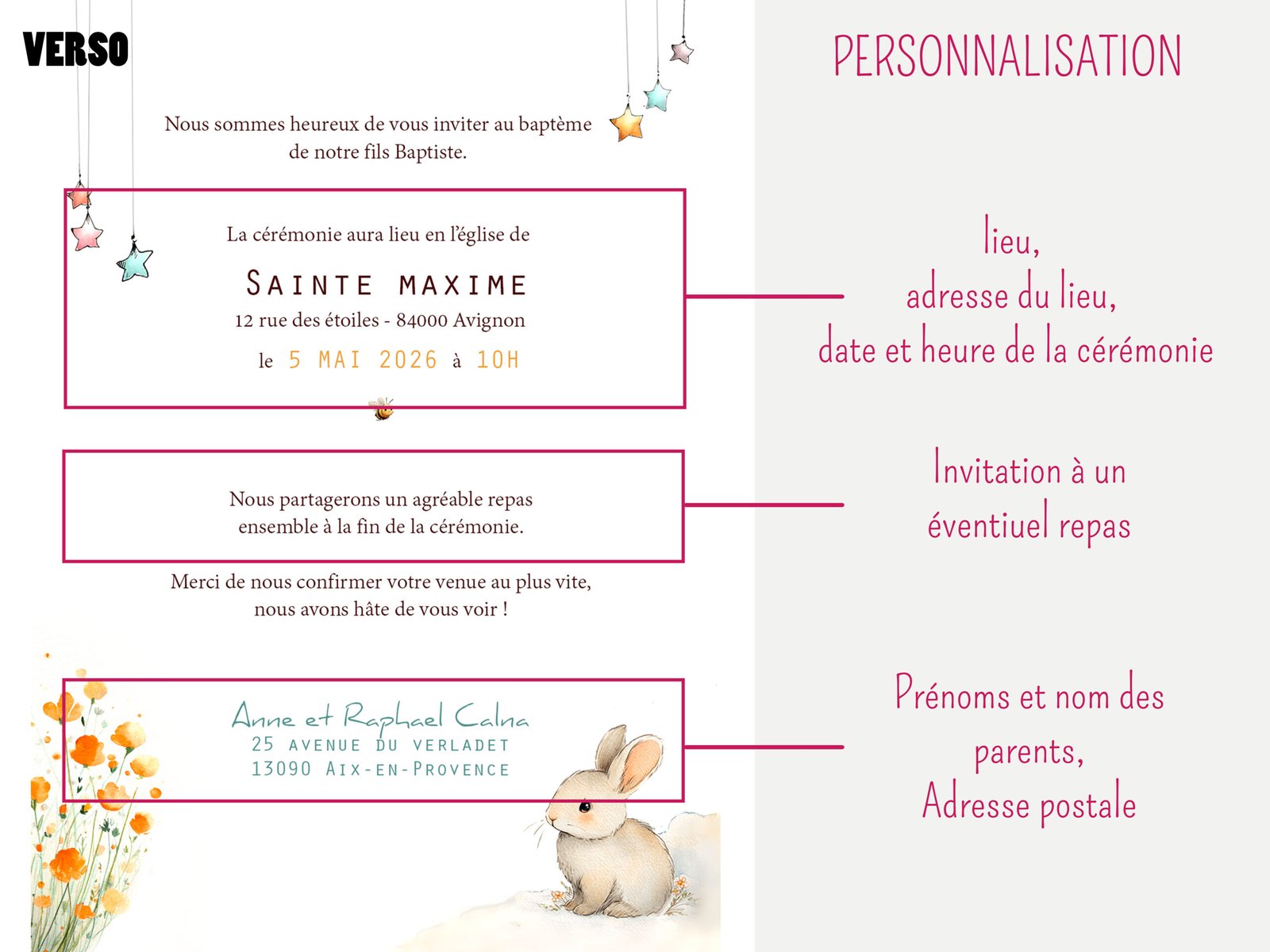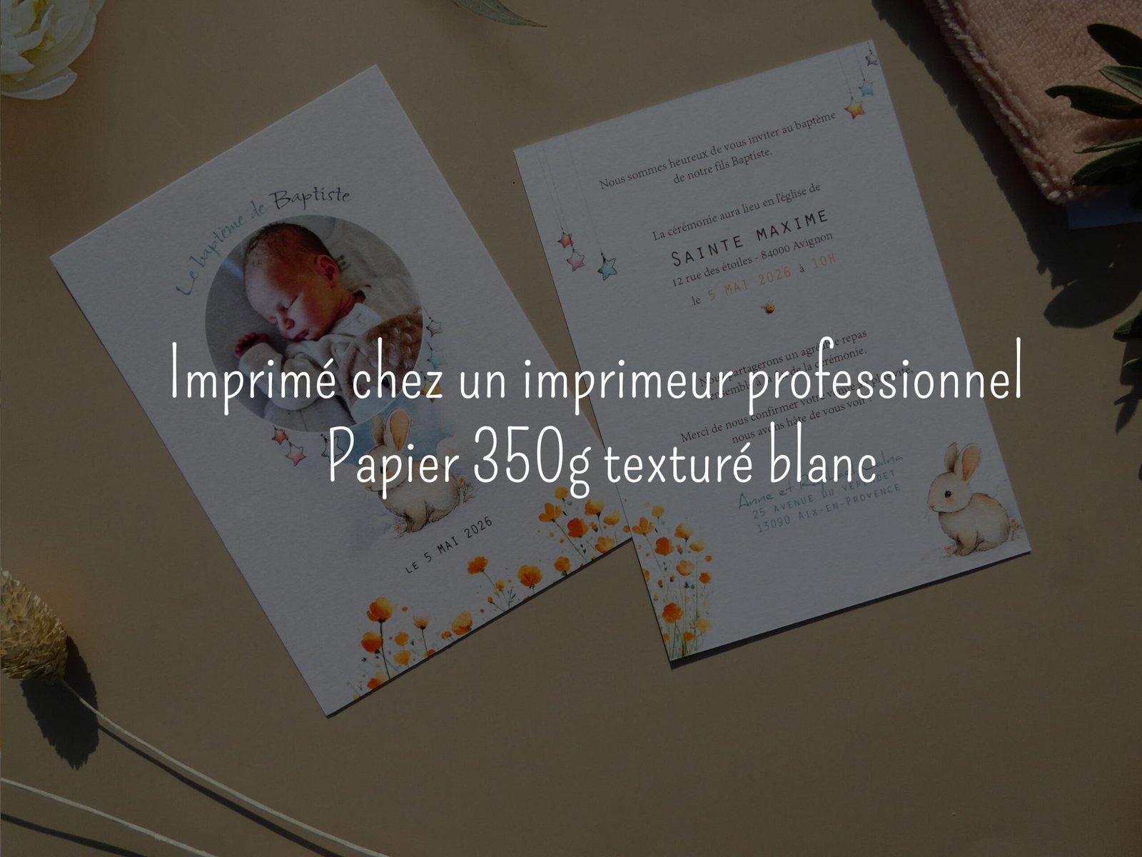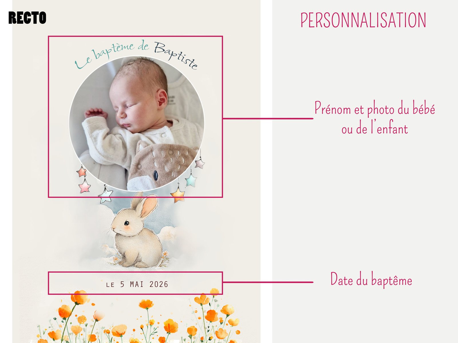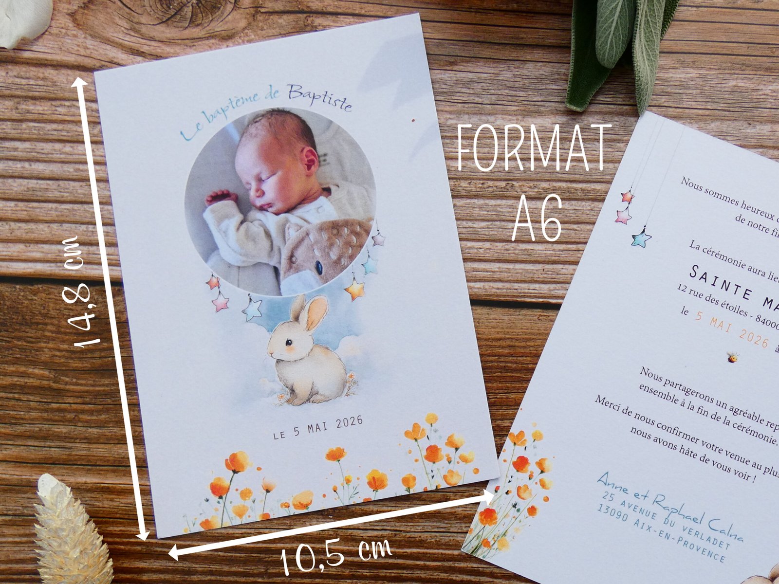 Faire-part de baptême mixte, fille ou garçon, thème petit lapin, poétique et rêveur