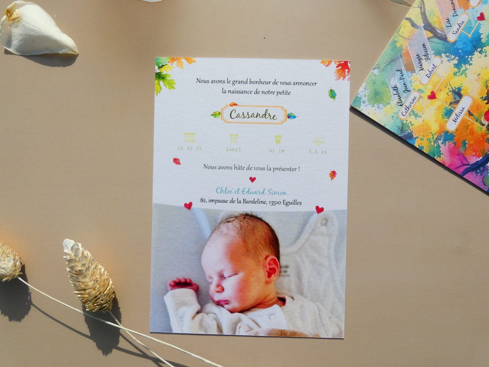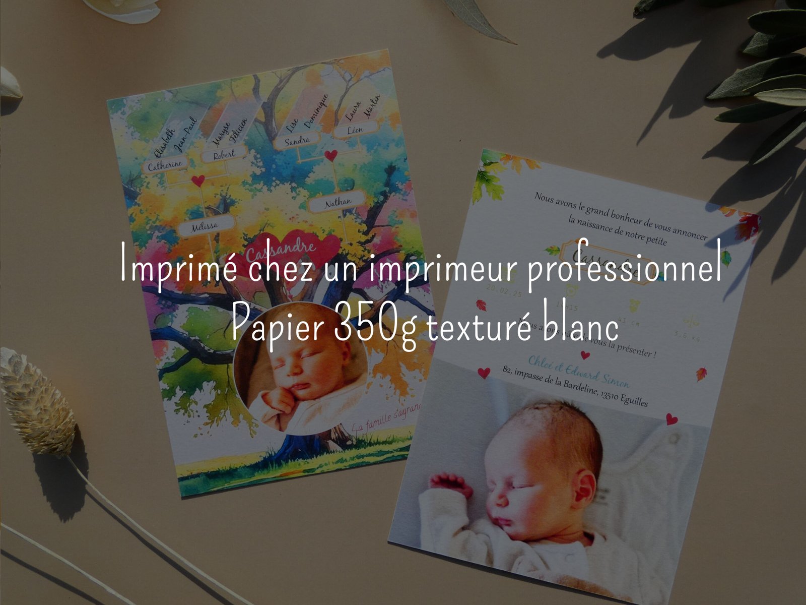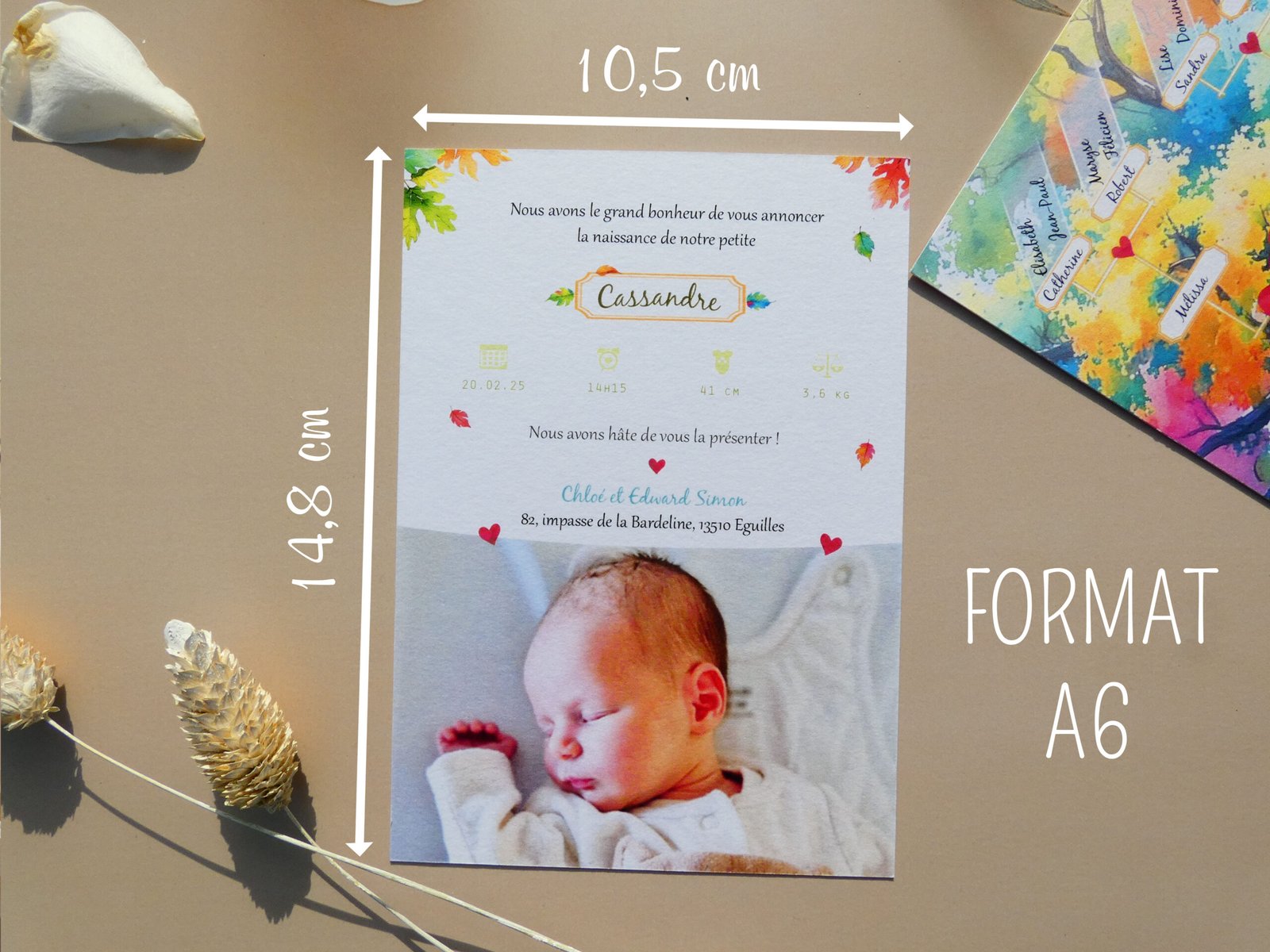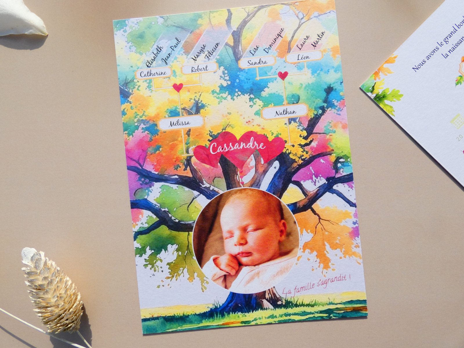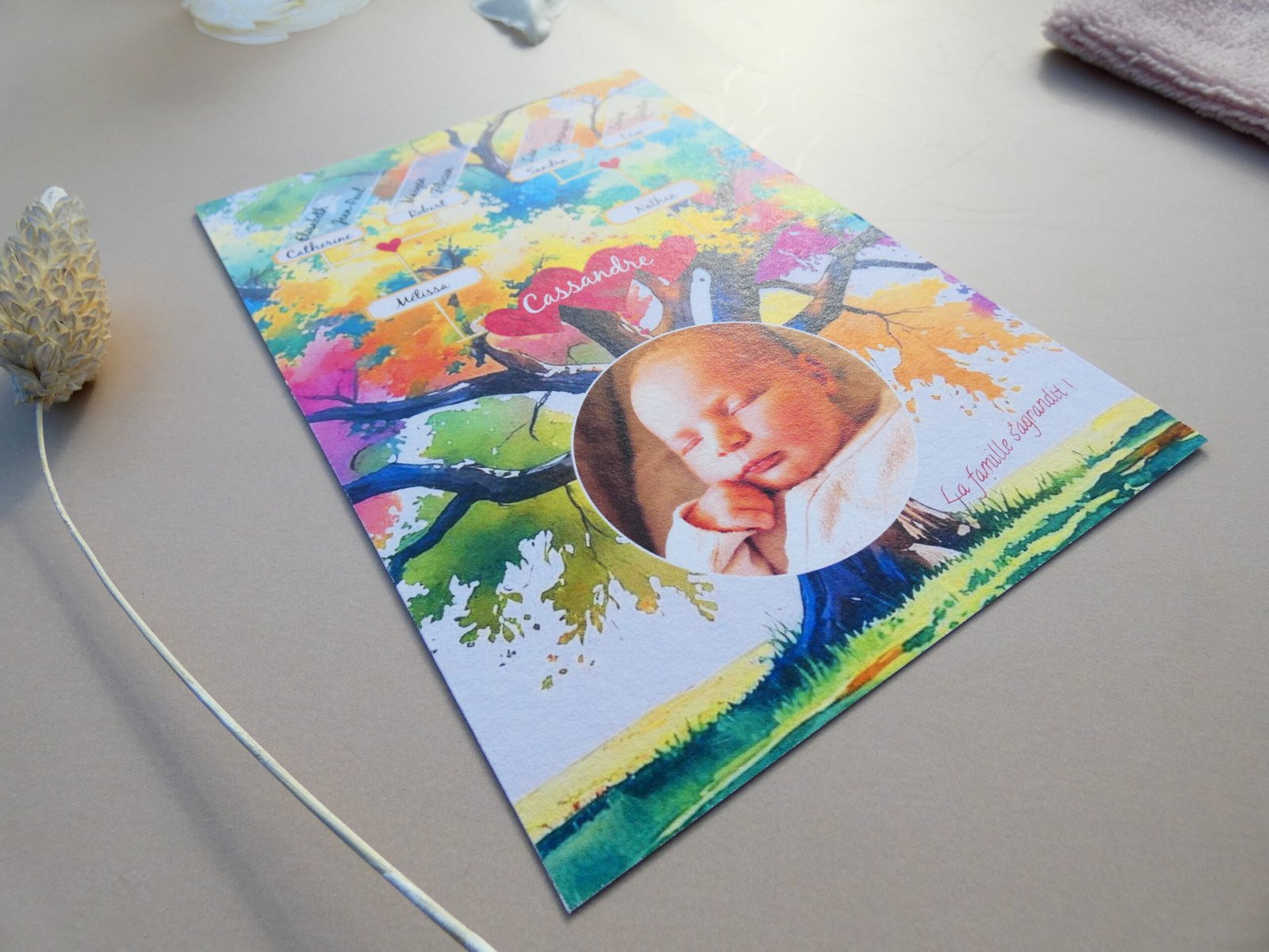 Réalisé par mes soins et imprimé dans une imprimerie sur du papier 350g texturé au format 10,5 cm x 14,8 cm (format A6), sur le thème de l’arbre généalogique qui met à l’honneur la famille, parents, grands-parents et même arrière grands-parents !