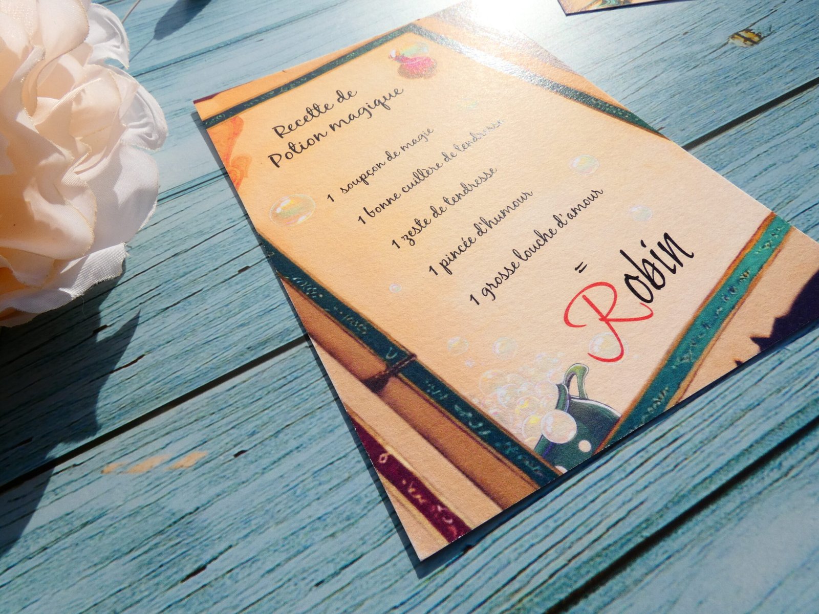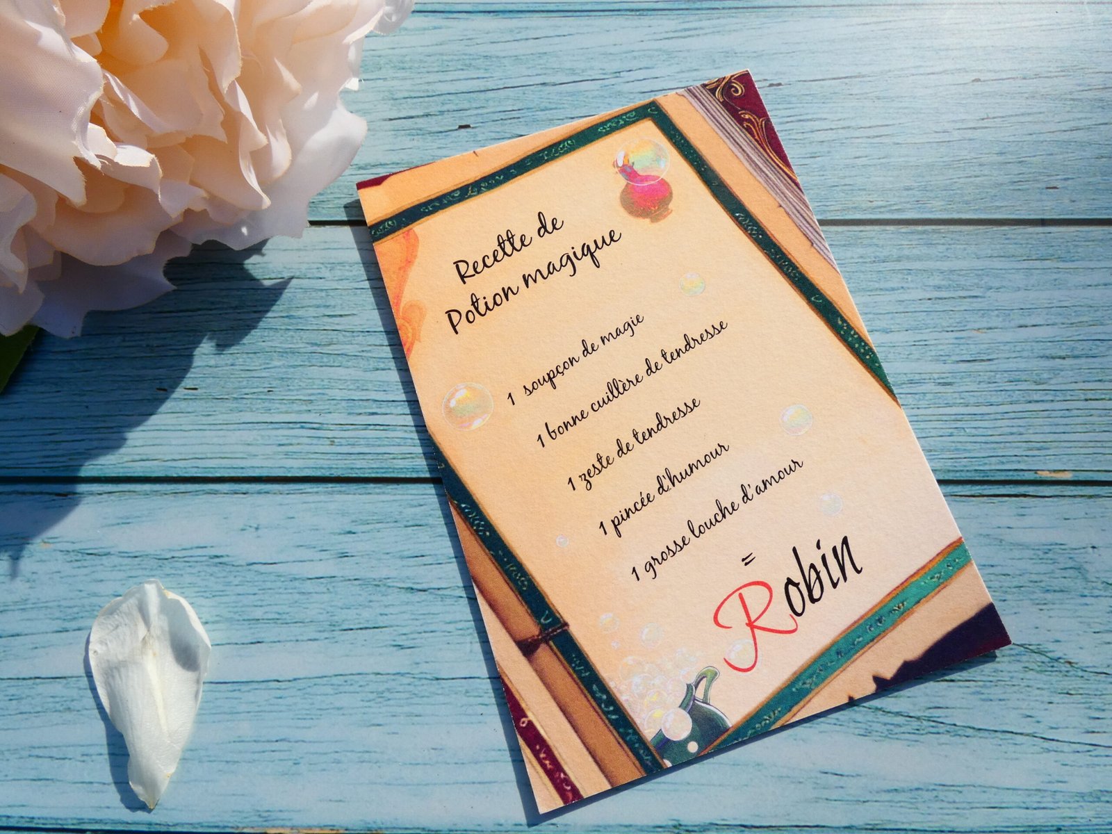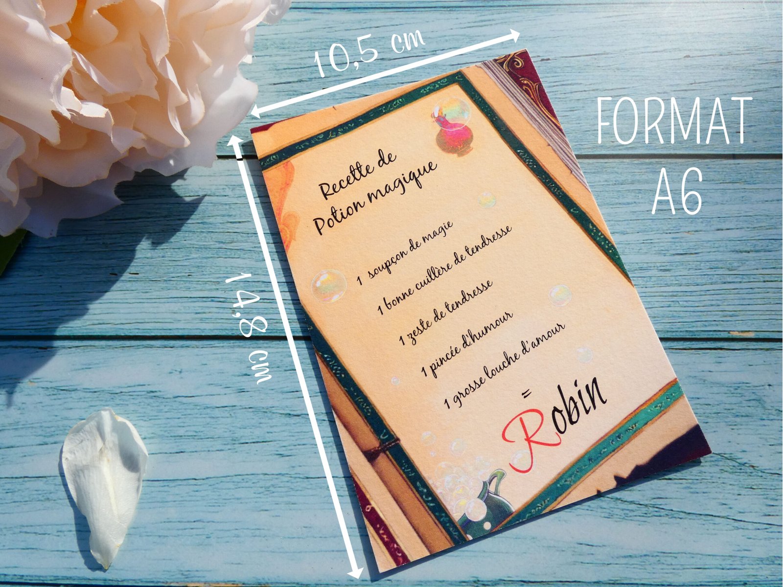 Réalisé par mes soins et imprimé chez un imprimeur professionnel sur du papier 350g texturé au format 10,5 cm x 14,8 cm (format A6), sur le thème potion magique et élixir d’amour.