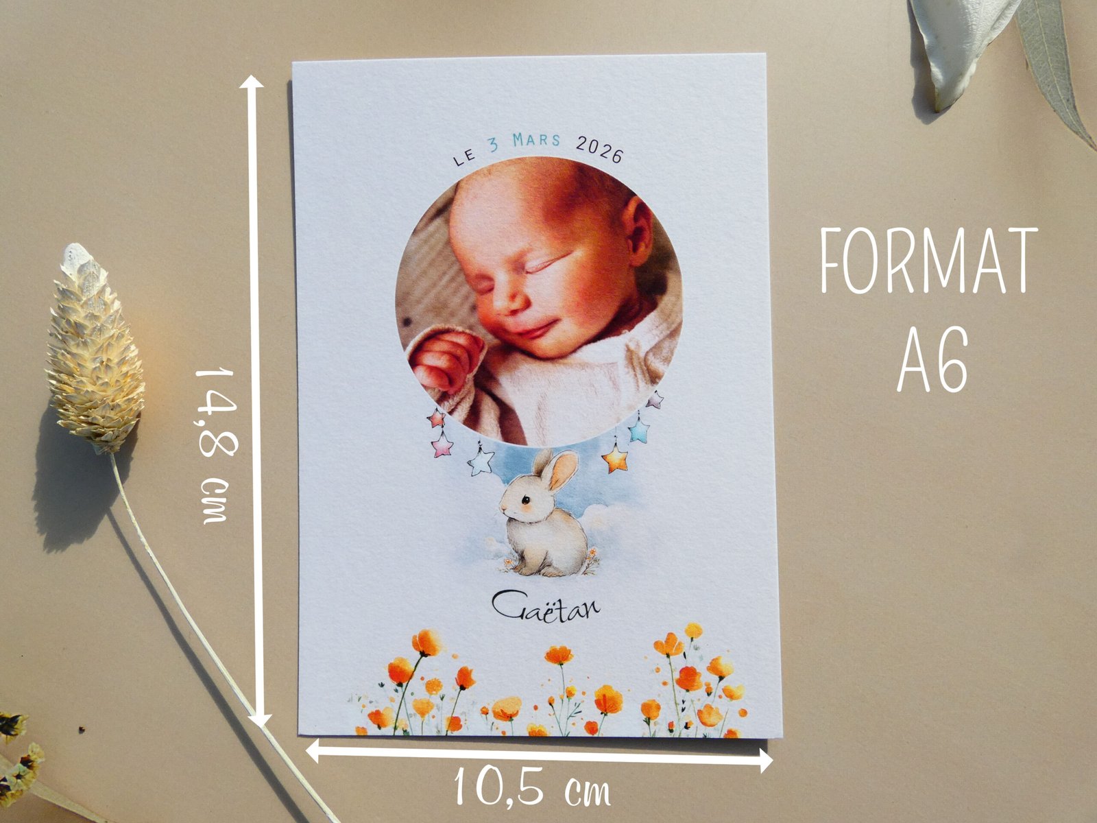 Réalisé par mes soins et imprimé chez un imprimeur professionnel sur du papier 350g texturé au format 10,5 cm x 14,8 cm (format A6), sur le thème petit lapin et petits nuages, rêveur et poétique, évoquant la douceur et la légèreté.