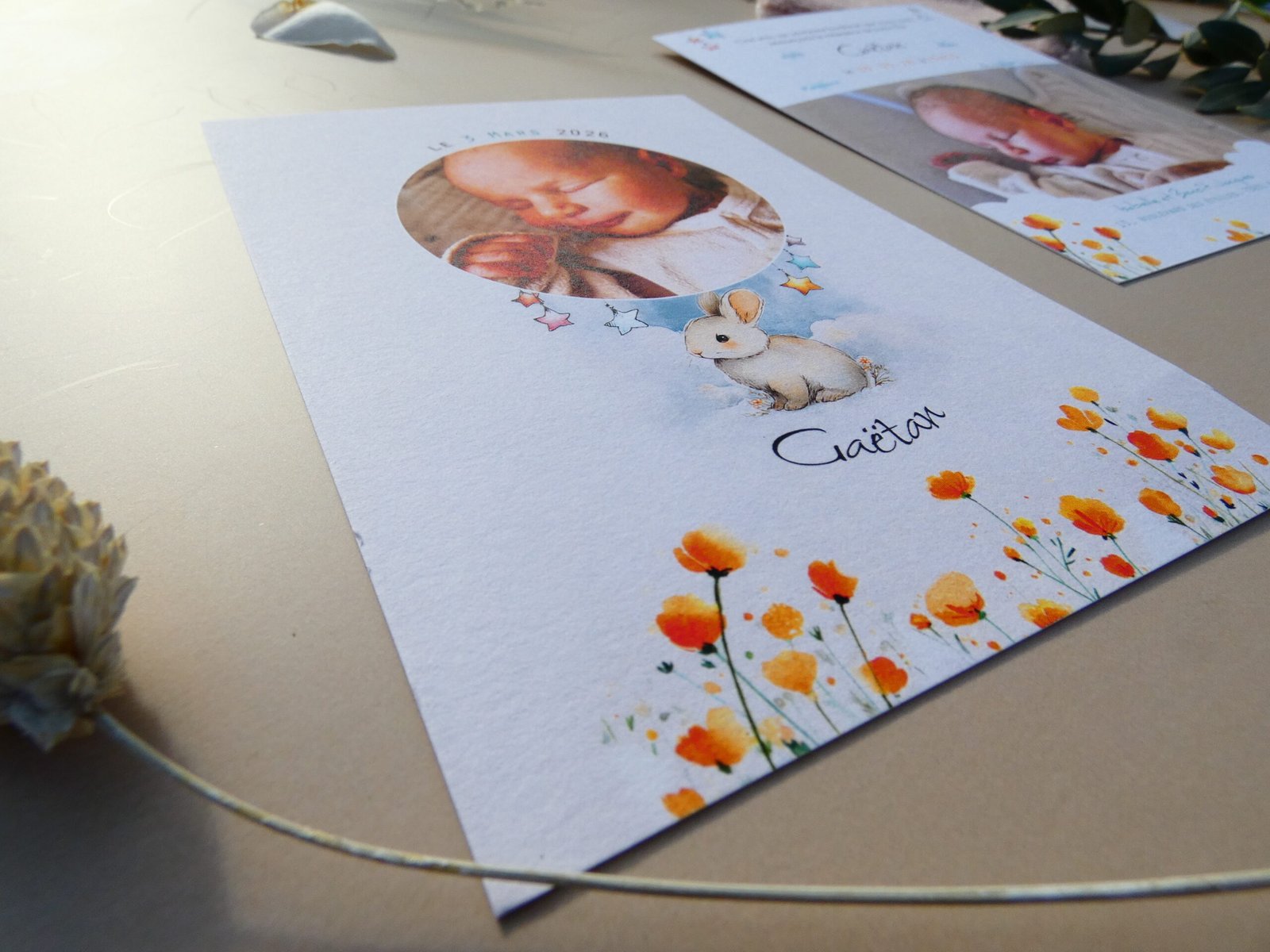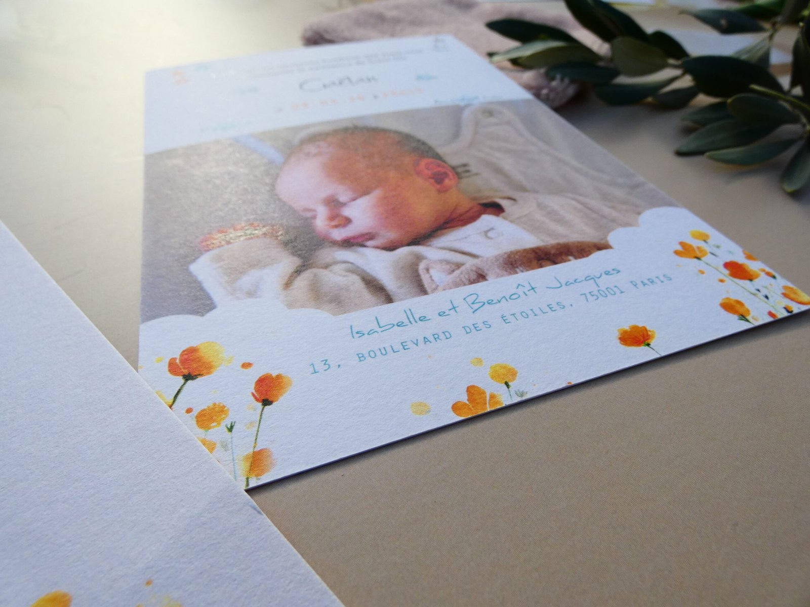 4 – Expédition : Après votre validation de la maquette envoyée, je me déplace en imprimerie pour imprimer vos faire-part et vous les envoie au plus vite !