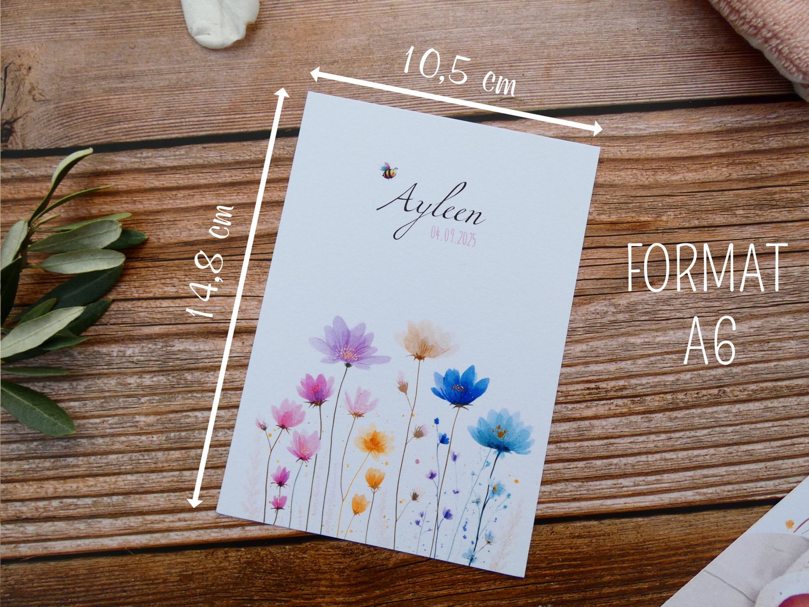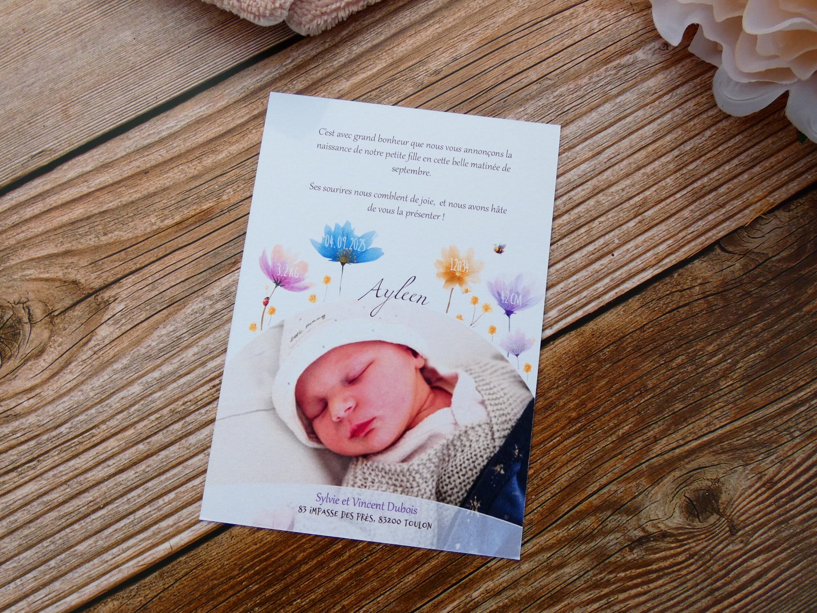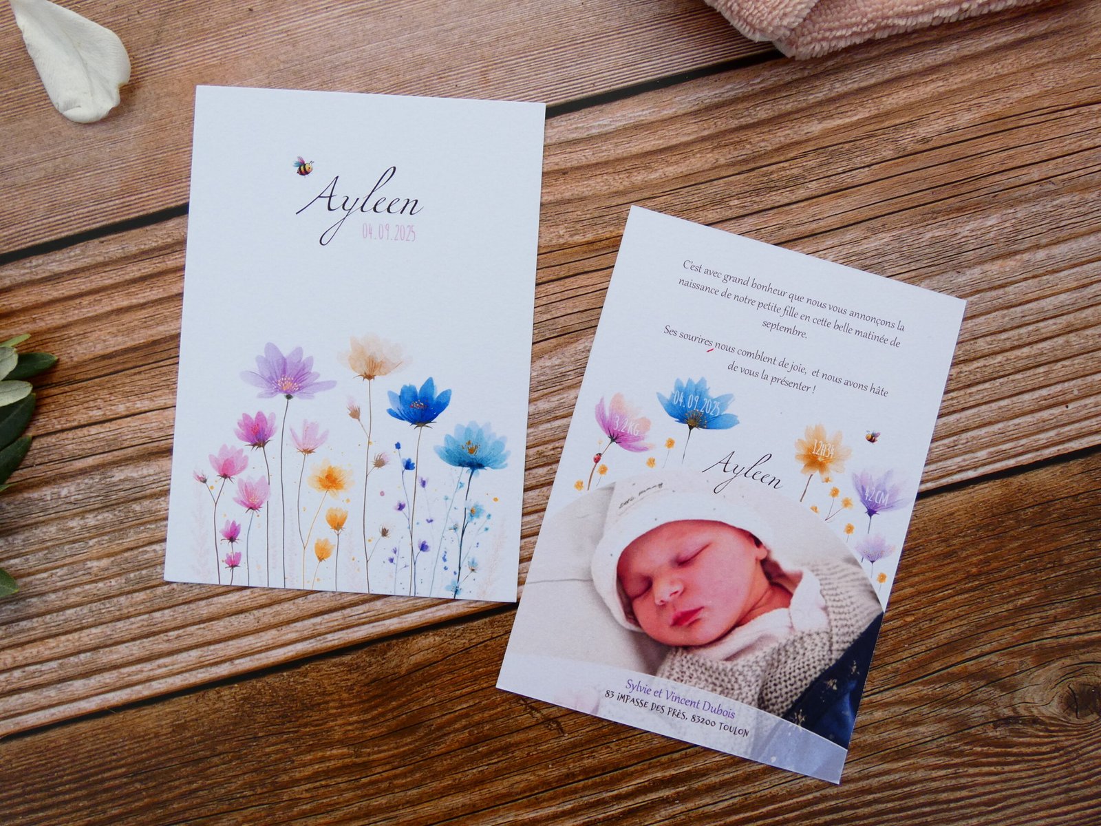 Réalisé par mes soins et imprimé chez un imprimeur professionnel sur du papier 350g texturé au format 10,5 cm x 14,8 cm (format A6). Dans un thème fleuri et coloré, ce faire-part apportera une touche de légèreté et d’enchantement à la naissance de votre enfant.