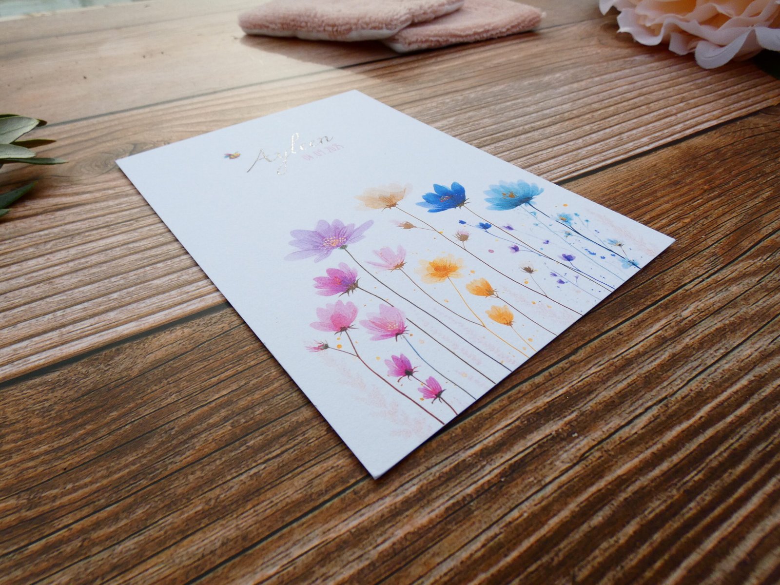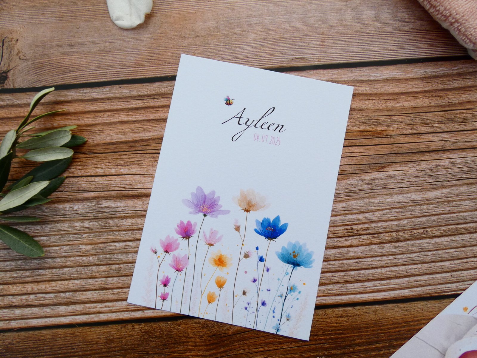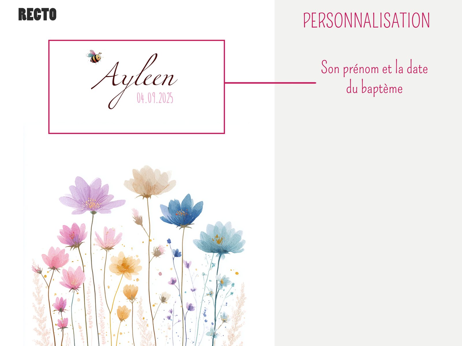 Réalisé par mes soins et imprimé chez un imprimeur professionnel sur du papier 350g texturé au format 10,5 cm x 14,8 cm (format A6). Dans un thème fleuri et coloré, ce faire-part apportera une touche de légèreté et d’enchantement à la naissance de votre enfant.