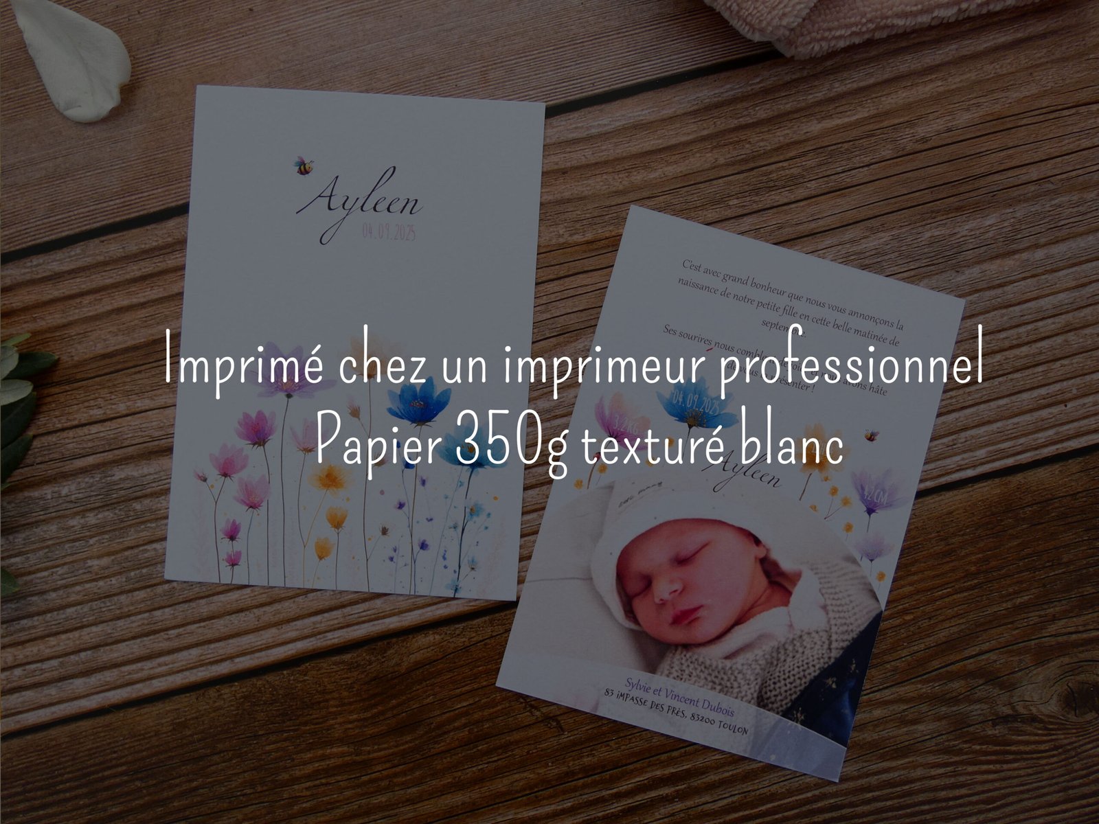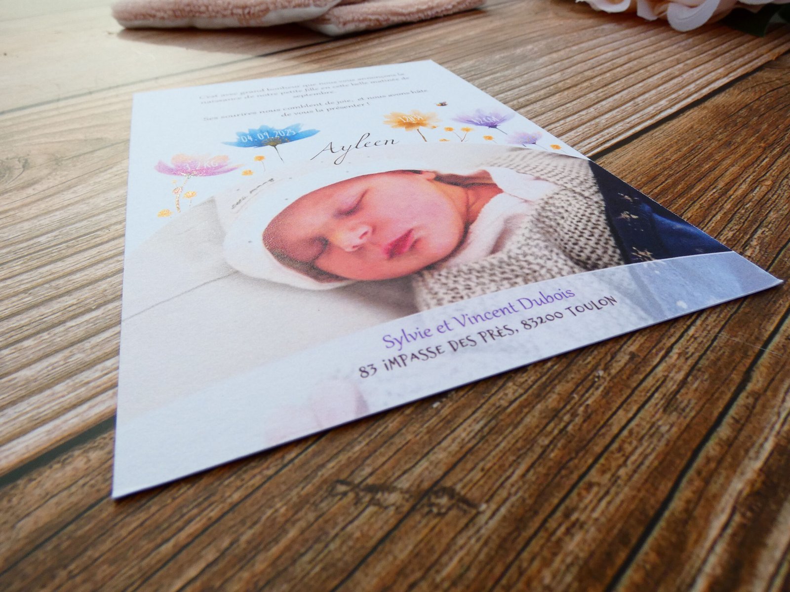 4 – Expédition : Après votre validation de la maquette envoyée, je me déplace en imprimerie pour imprimer vos faire-part et vous les envoie au plus vite !